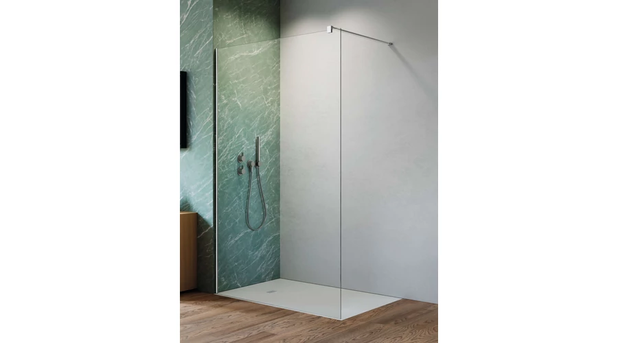 Fali profillal a falra szerelhető pengefal 6 mm-es Easy Clean edzett üvegből.